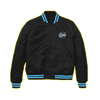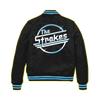 The Strokes Magna logo in blue on the front and back of a black, unisex, Starter varsity full-snap jacket.